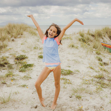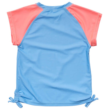 It's vacation vibes with our Cornflower Peach Short Sleeve Rash Top. The block-color girls rashguard is UPF50+ for all-day play, featuring side ties that rouche for the ultimate surf n swim look at the beach! Whip on over your swimsuit, especially between 11am -3pm.