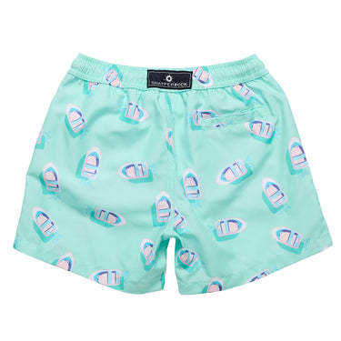 Be the best at the beach in our Float Your Boat Swim Short. These mint green print boys' summer shorts are made of UPF50+ sustainable swimwear fabric, with a navy and white fleck drawcord and mesh lining for comfortable activities and chill hangouts on the shore.
