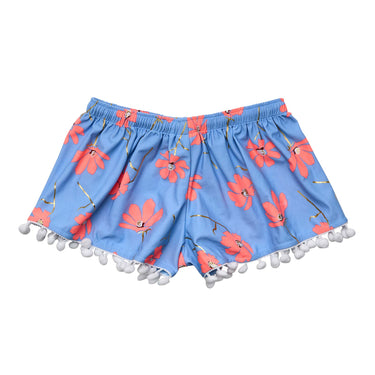 Hit the beach for an all-day chill session in our Beach Bloom Swim Shorts. The swimwear fabric features a summery blue and coral flower design, a white rope drawcord with tassels and a white pom pom trim.