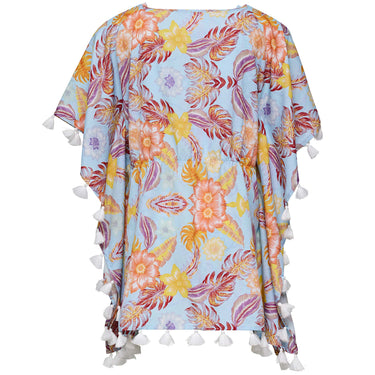 Live your dreams of an island haven vacation in our Boho Tropical Cover Up. The batwing beach coverup is perfect for breezy afternoons with the blue floral print and white tassel trim looking extra fantastic when paired with a straw beach hat and flip flops.