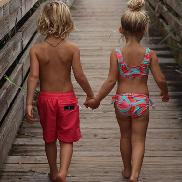 Bright and bold, your girl will be making a splash at the pool in our fun Geo Melon print. This girls' crop bikini features ties on the top and bottoms and a keyhole cut-out at the front. Snapper Rock sustainable swimwear is made from REPREVE® recycled fabric, complete with home compostable packaging and recycled paper swing tags. Look good while doing great for the environment!