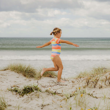For the perfect t-shirt and bathing suit combo, look no further than our Good Vibes Short Sleeve Surf Suit. The wave-inspired pastel fabric is UPF50+ for maximum ray protection, featuring a fashionable front zip for easy changing between the beach and hotel.