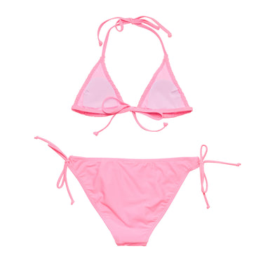 Soak up the sun in this pink textured triangle bikini for tweens and teens. The shirred fabric cups slide along the lower strap for a customizable fit on top, while the bow side straps add a playful twist to the solid pink bottoms. Perfect for girly girls who value both comfort and chic beach style.