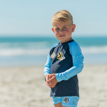 Embark on a tropical journey with our vibrant Angel Fish collection for boys. Set against a tranquil powder blue backdrop, the lively Angel Fish, marked by striking black stripes and sun-kissed yellow bodies, takes center stage. Whether your young explorer is navigating nature's enchanting rock pools or snorkeling amidst the corals of the tropics, this collection ensures they're dressed to impress and ready for the adventure. A captivating blend of color and charm, it's the perfect attire for every young adventurer.