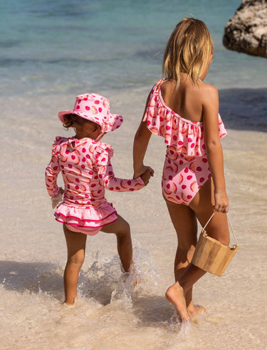 This is a matching sibling collection—perfect for sisters. Many of our collections offer multiple styles in the same print, so whether it’s a cute one-piece with frills or a playful bikini, your little ones can find their favorite fit. Discover more of our matching family collections in the Matching Family Swimwear section on our site!
