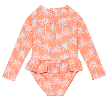 Palm trees, long sleeves and the cutest frill skirt - this one's made for sunny play days and sandy giggles. The Cali Palms Recycled Skirt Surf Suit features our all-over Cali Palms print with a sweet built-in skirt, back zip, and snap domes for easy changes.