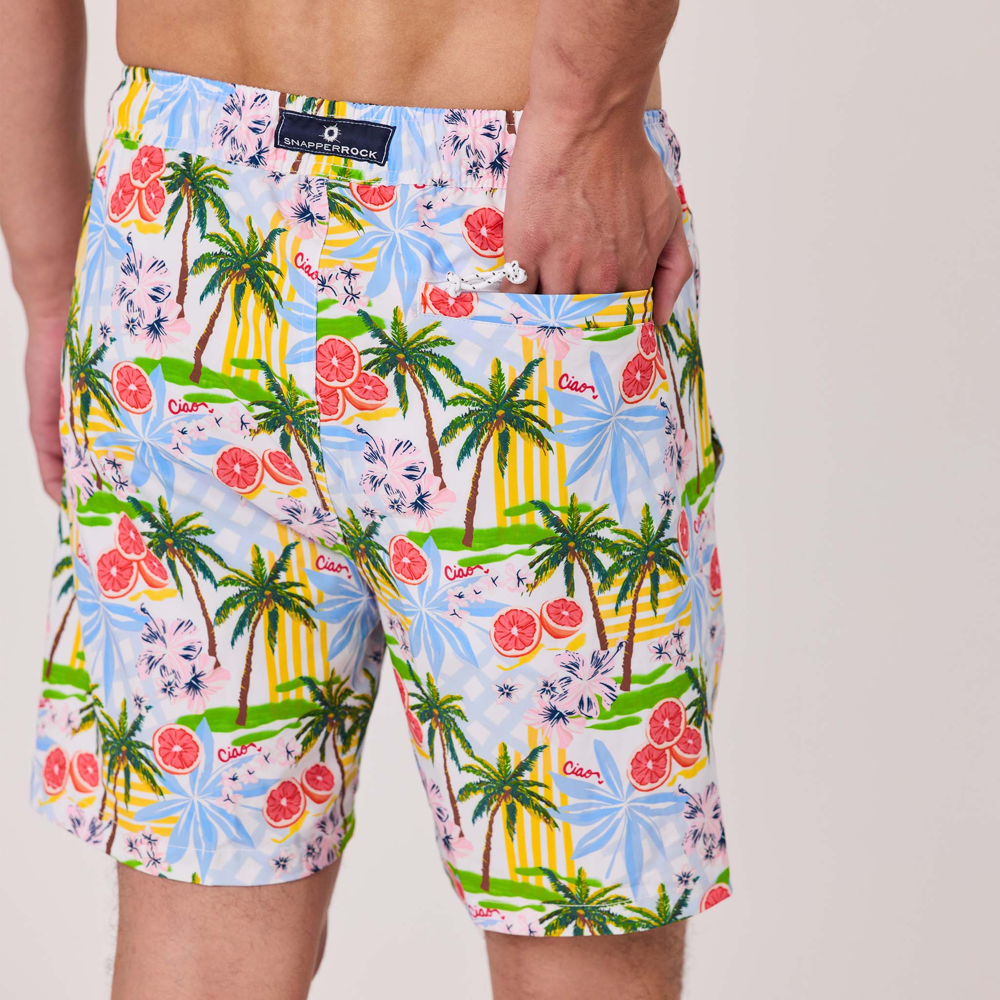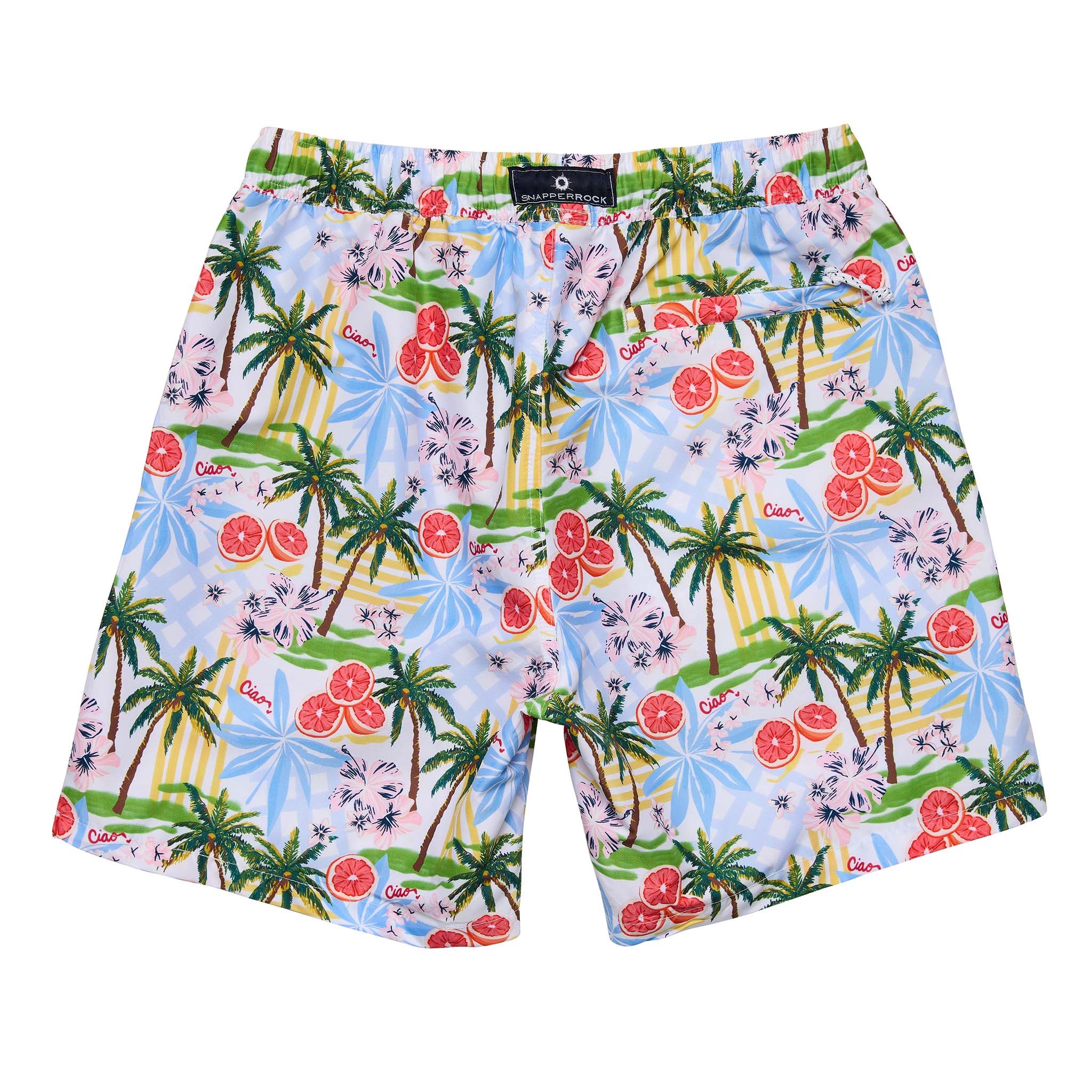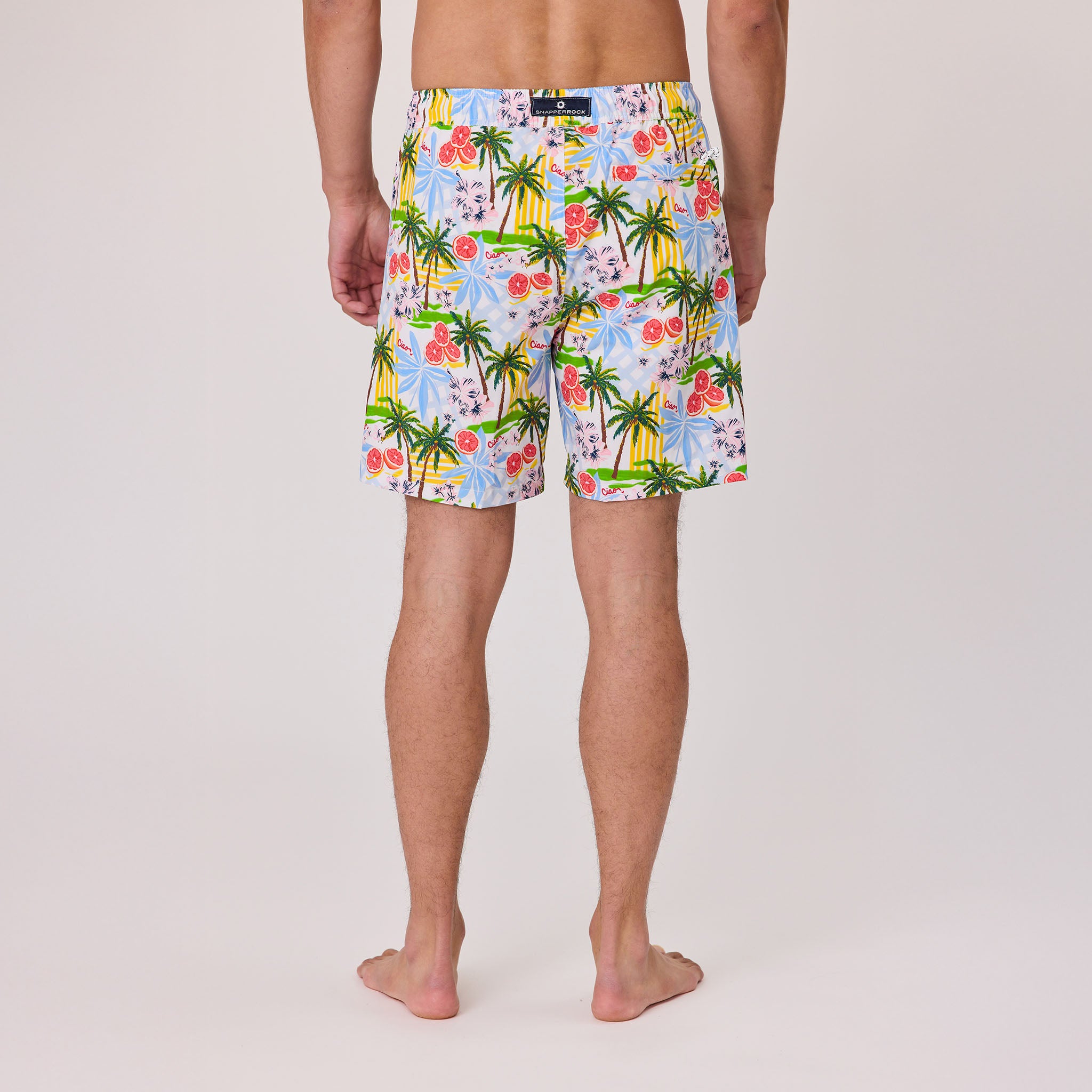 Turn heads from beach to bar. The Mens Ciao Paradiso Swim Short is loud, lively, and ready to make a splash - just like the Italian summer that inspired it. Made from recycled UPF50+ fabric, with an elastic waist, drawcord, and inbuilt comfort liner to keep you moving in comfort (and style).