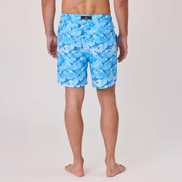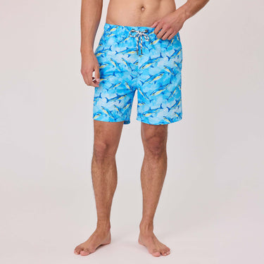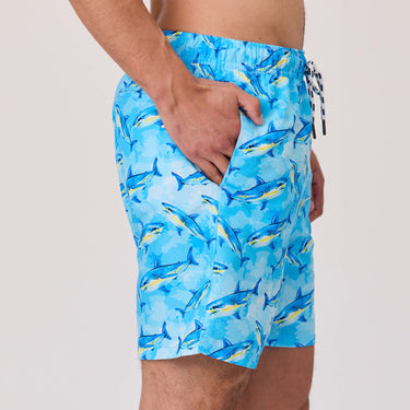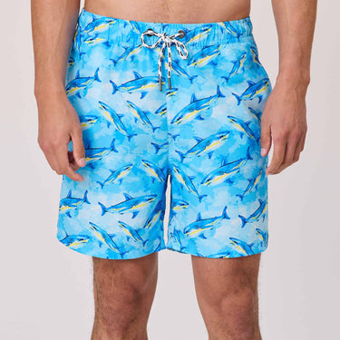 Match the little ones in style with these men's swim shorts, featuring the same dynamic shark print. Designed with an adjustable drawcord waist and a secure white-zipped back pocket, they're perfect for active beach days or lounging by the pool, offering both style and function.