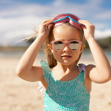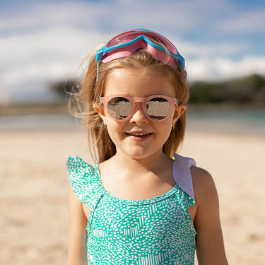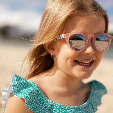 All lenses are made from impact-resistant Polycarbonate and offer 100% Ultraviolet Protection (Category 3) in compliance with the Australian Standards AS/NZS:1067. Candy Pink Frame with stripe arms. Lens are Siver Mirror.