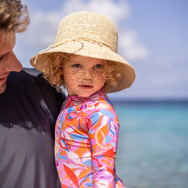 Catch the sunset hues with this frilly skirt girl's surf suit, designed with a vibrant tropical print that echoes the colors of golden hour. It features a skirt at the waist and a durable pink zip at the back for easy wear. Ideal for young beach explorers, it offers both fun style and practical comfort.