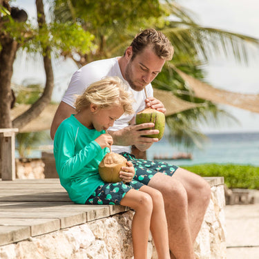 Our men's short sleeve rash guards blocks 98% of all harmful rays. Made from recycled Nylon. ECONYL yarn has been created from discarded fishing nets that have been left in the ocean. An estimated 640,000 tonnes of used nets are left in the ocean every year, these are collected and transformed into new nylon fibre which is used to make our Sustainable swim collection. Wearers not only look good, they're doing good too. Enjoy the sun, save the world. That's what a perfect summer look like.