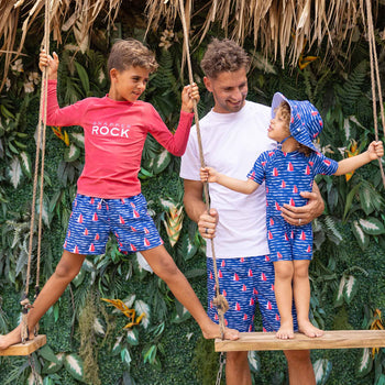 From the sailboat-print swim shorts to the short-sleeved sunsuit, the Sailboat Rock collection is crafted for comfort, practicality, and style. Whether you're enjoying a day on the boat, building sandcastles on the shore, or lounging by the pool, these designs ensure you and your little sailor are ready for any adventure in matching swimwear for boys.