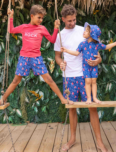 Set sail in style with the Sailboat Rock collection, designed to capture the elegance and adventurous spirit of the open sea. With a classic nautical palette of navy, red, blue, and white, this collection offers matching swimwear for boys and dads, perfect for unforgettable summer adventures.