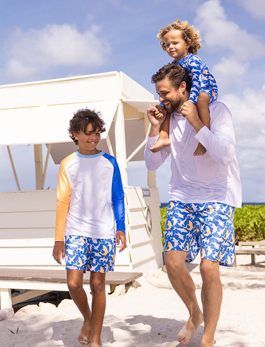 Shark Squad is all about bold color and big energy. This electric blue swim print features a mix of white and neon orange sharks, perfect for father and son matching swim and making a splash.