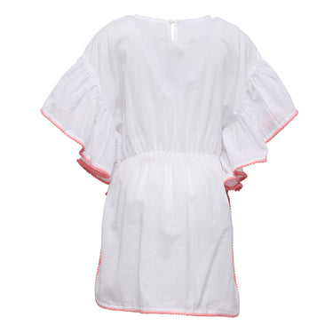 This pretty beach cover-up is beautifully embroidered with spring flowers around the neckline and features a flowing white silhouette with delicate pink pom pom trim.  A summer must have for your little beach goer.