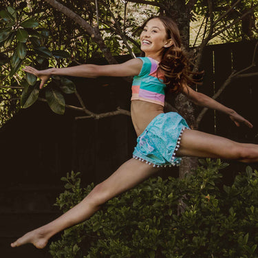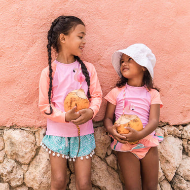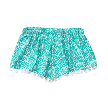 Rock pool and sea shore exploring are perfect in our Spearmint Spot Swim Shorts. Featuring our minty fresh Spearmint Spot print, and white pom pom trim details.