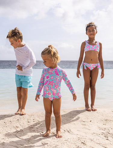 Snapper Rock’s boldest matching family swimsuit collection yet, Tropical Glow is made to turn heads—from beach to boardwalk. With fuchsia and hot pink tropical florals on an aqua base, it’s eye-catching in all the right ways. Matching styles are available for girls, teens, women, and coordinating aqua swim shorts for dads and sons. Tropical Glow is perfect for families who want that fun, confident matching moment. Crafted in recycled UPF50+ fabric, it’s high-impact, low-fuss, and built for summer living.