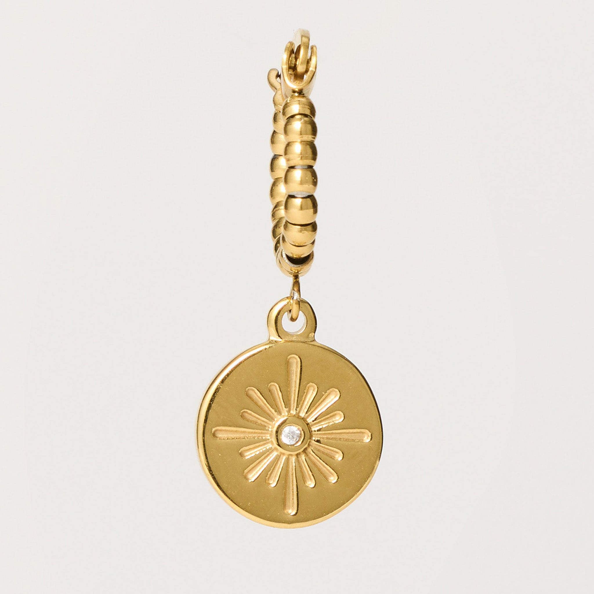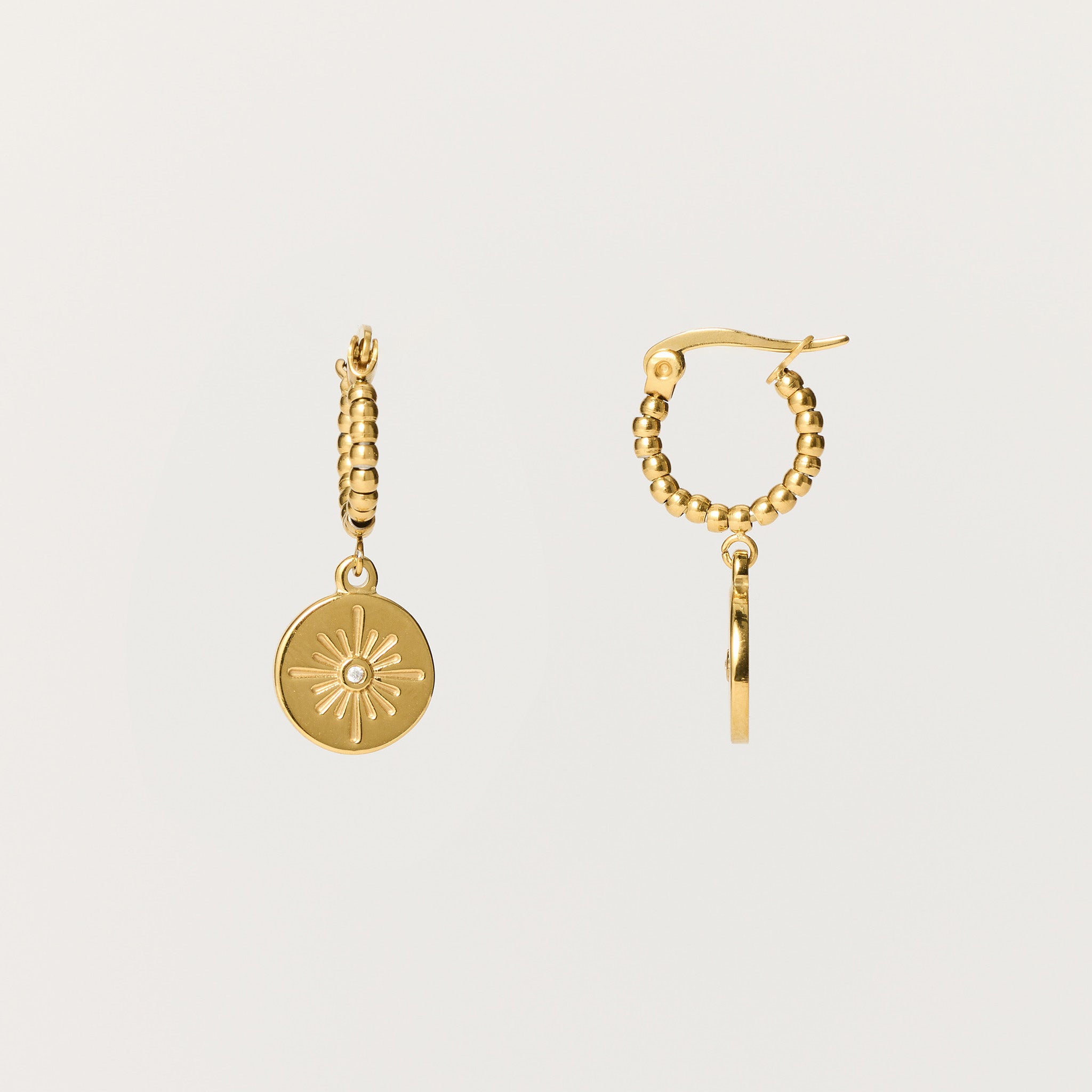 • Lightweight hoop earrings with sun disc charm