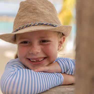 Look super-suave at the beach and on the boardwalk in our Boys Braid Fedora. The summer hat is designed to offer extra protection from the sun. Featuring a blue, navy and olive braid along the trim to complete any summer vacation look.