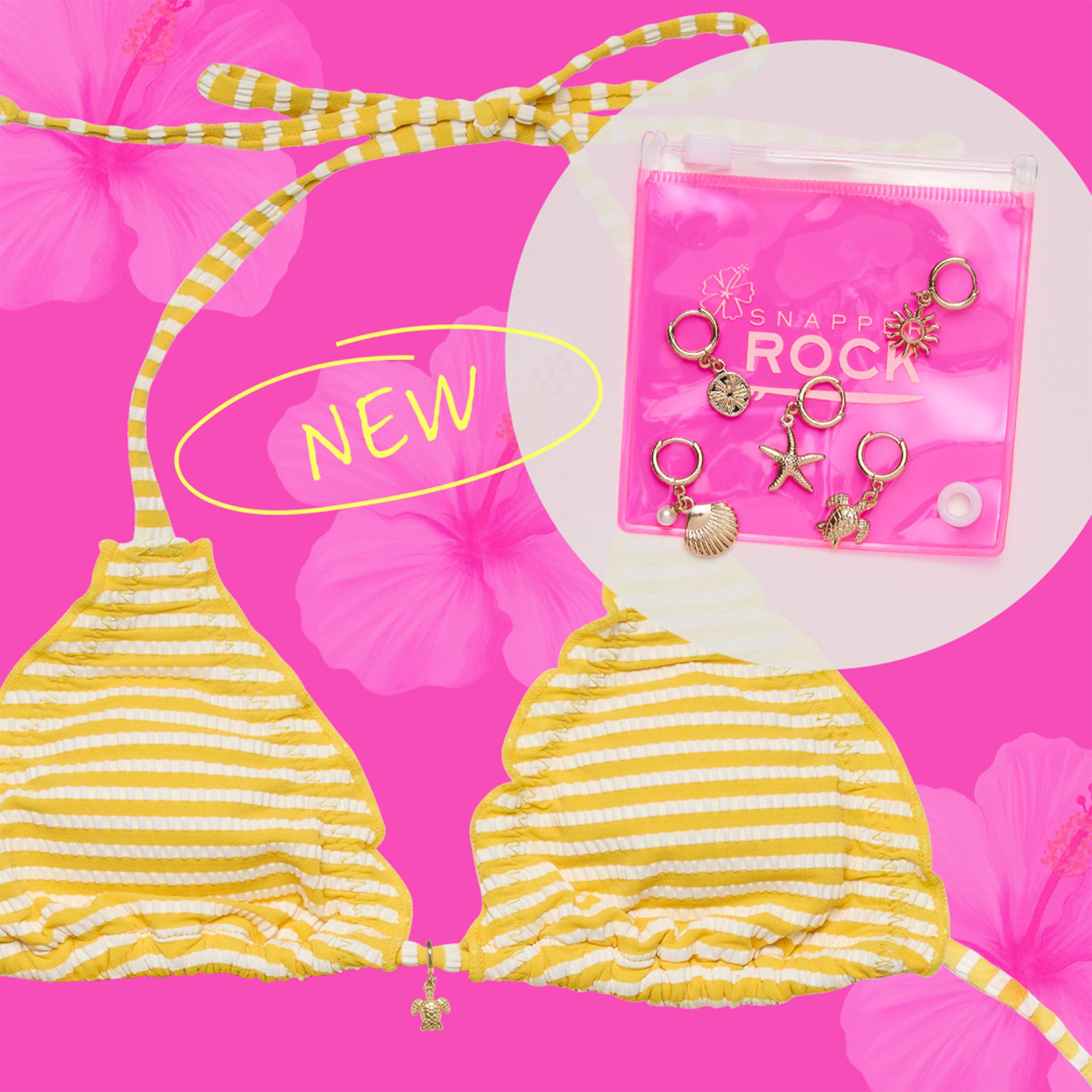 Add a touch of sparkle to your swimwear! These gold bikini charms are made from 100% zinc alloy and electroplated for a shiny, long-lasting finish. Perfect for accessorizing your favorite Snapper Rock triangle bikinis or adding a cute charm to bracelets and necklaces!