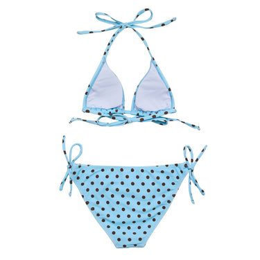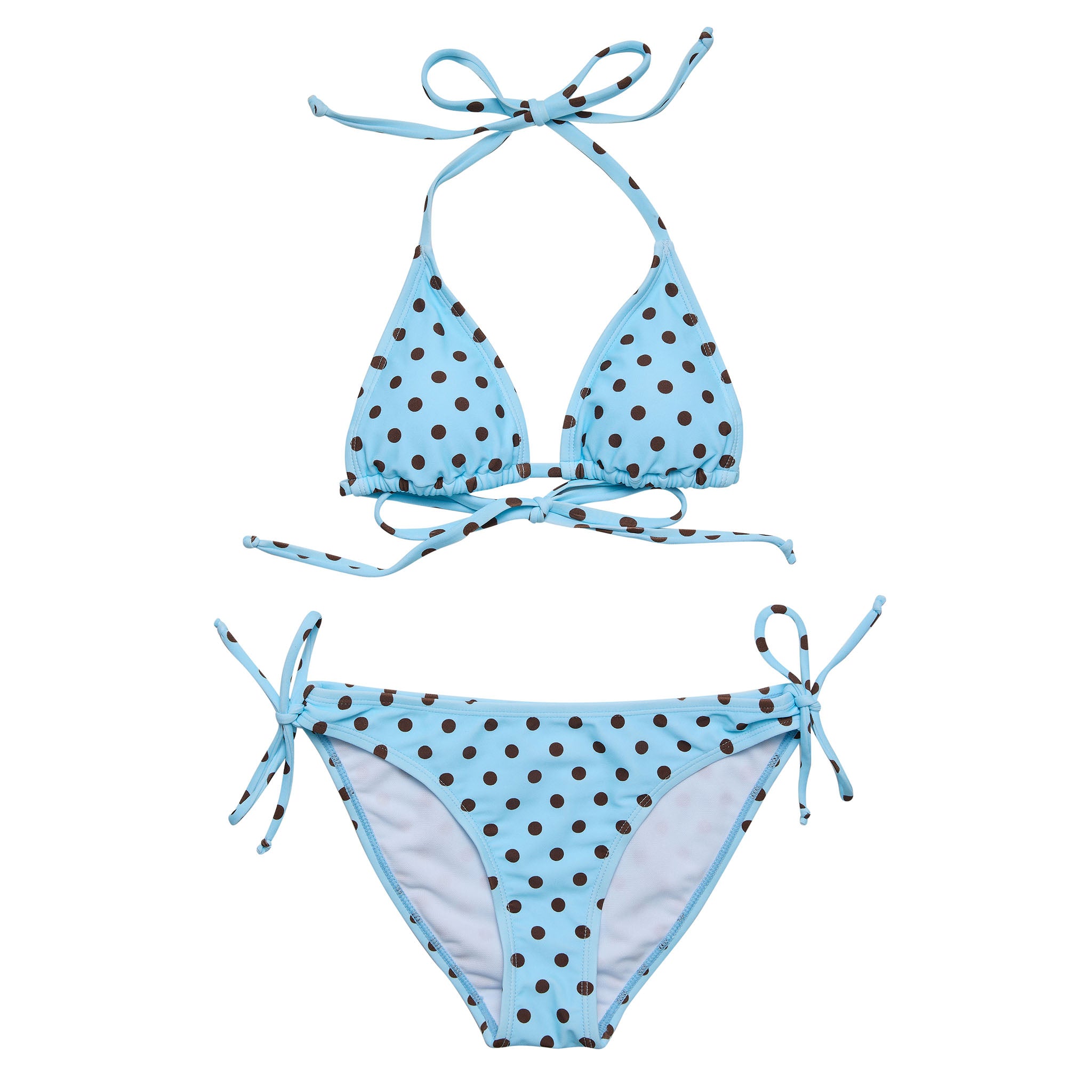 The Cocoa Capri Teen Triangle Bikini features a classic cocoa brown polka dot print on a soft sky blue base. The playful contrast gives this teen triangle bikini an easy, retro-inspired summer feel that looks fresh, fun, and effortlessly cool.