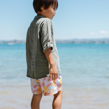 Look cool, calm, and super stylish in the new Frankie Resort Shirt. Made from a lightweight and breathable crinkled cotton muslin, these easy-to-wear shirts feature tortoise shell buttons and 3/4 rolled tab sleeve.