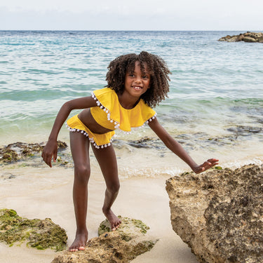 Hola! Ciao! Bonjour! to the Hello Yellow Flounce Bikini - the perfect addition to any little fashionista's summer wardrobe. This bikini is bursting with fun and playful features, including frills around the neck and waist, white pompoms, and the perfect shade of yellow that's sure to turn heads