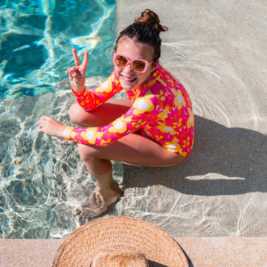 Catch those waves in style with the Pop of Sunshine Long Sleeve Surf Suit - the ultimate choice for surfer girls of any age! This children's swimsuit is groundbreaking in more ways than one - with a bold floral design and UPF50+ sun protection, so you can worry less about harmful UV rays and more about making those summer memories.
